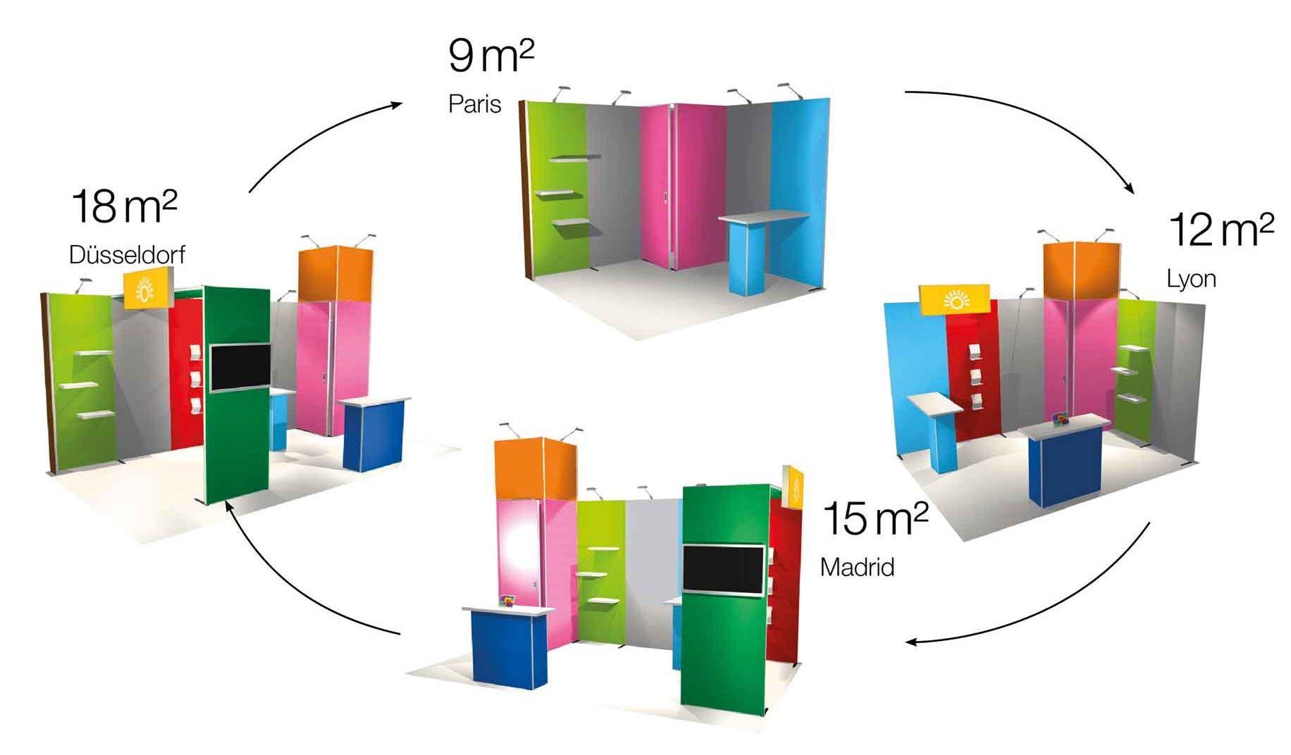 Nos stands modulaires, flexibles et réutilisables, s'adaptent à toutes vos surfaces d'événements, de 0 à 30 m², offrant une solution polyvalente et facilement duplicable.